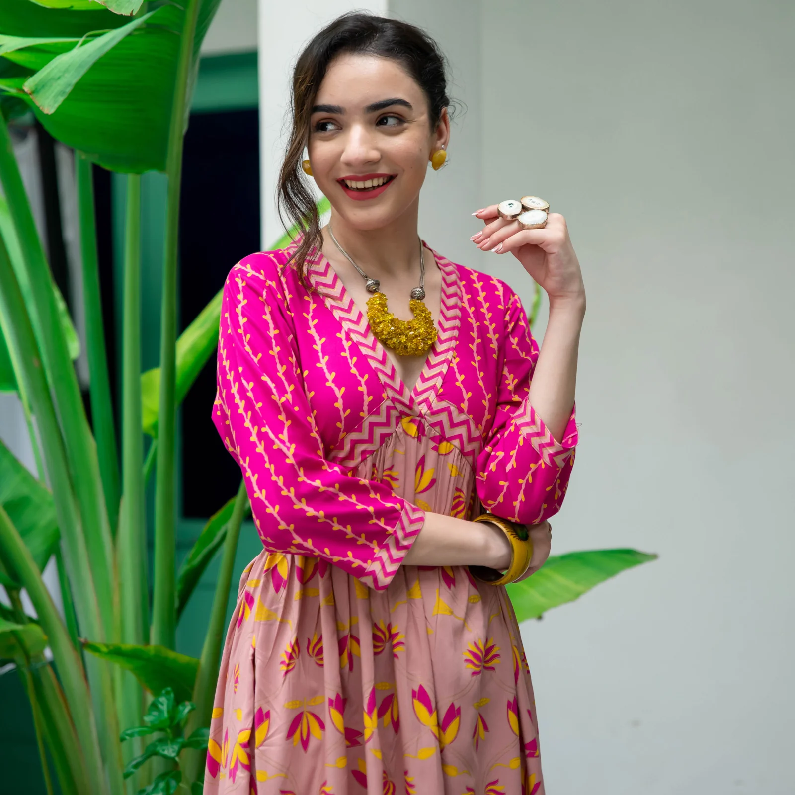 This is a baby pink and hot pink v-neck lotus Alia Cut dress with a flared shape that falls at calf length. Effortless yet stylish, this beautiful lotus printed dress is a wardrobe must have. Pair it up with the right kind of jewellery and you would be ready to shine bright at any occasion.The dress comes with pockets.