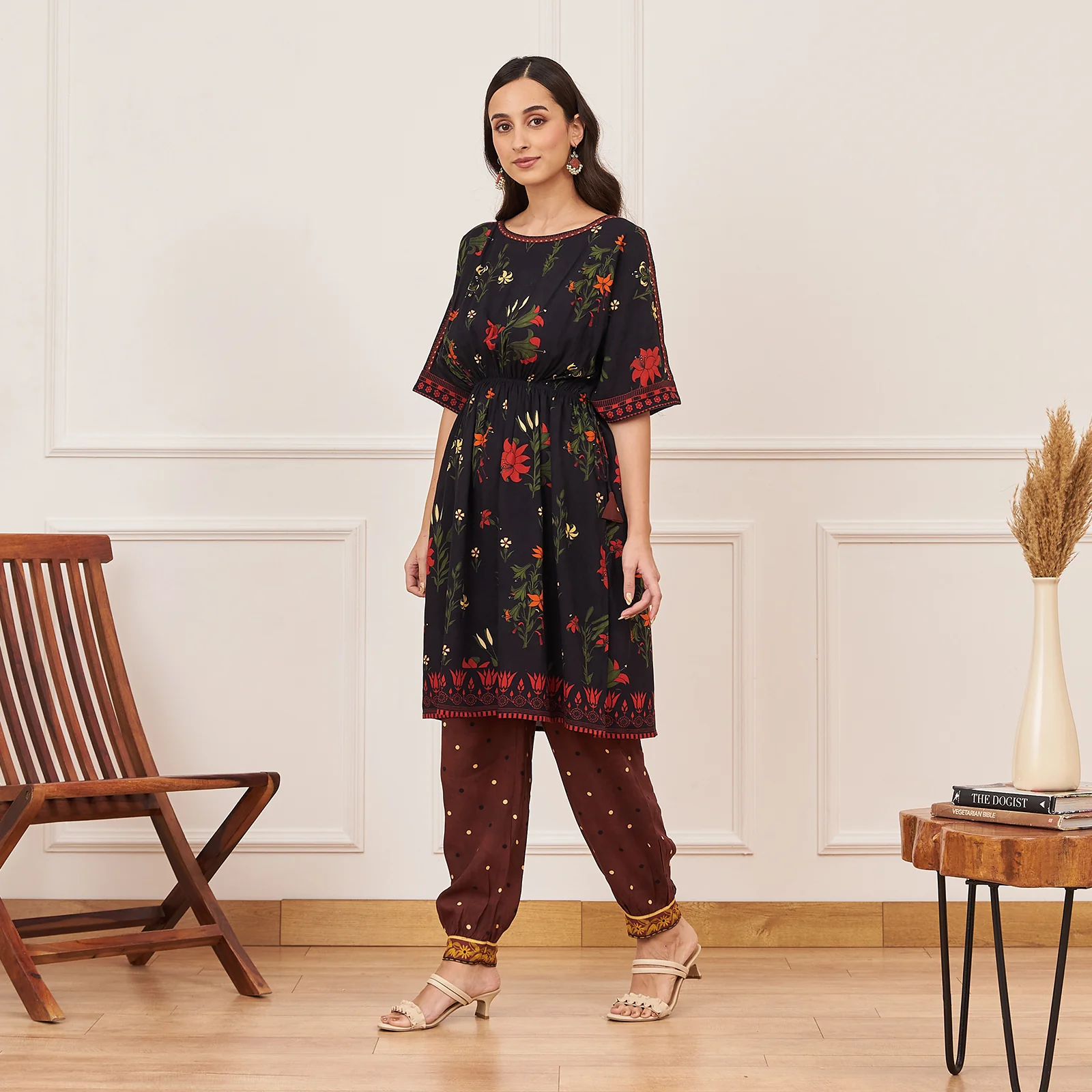 This ensemble features a floral-printed kurta co ord set with a drawstring at the waist, paired with a polka dot salwar. The boat neck adds elegance, while a pocket adds functionality.