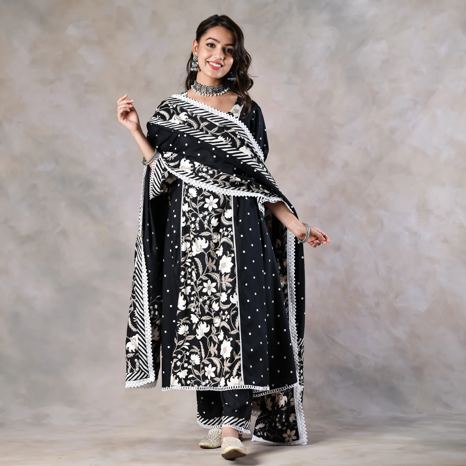 Black Floral Paneled Kurta Pant and Dupatta Set