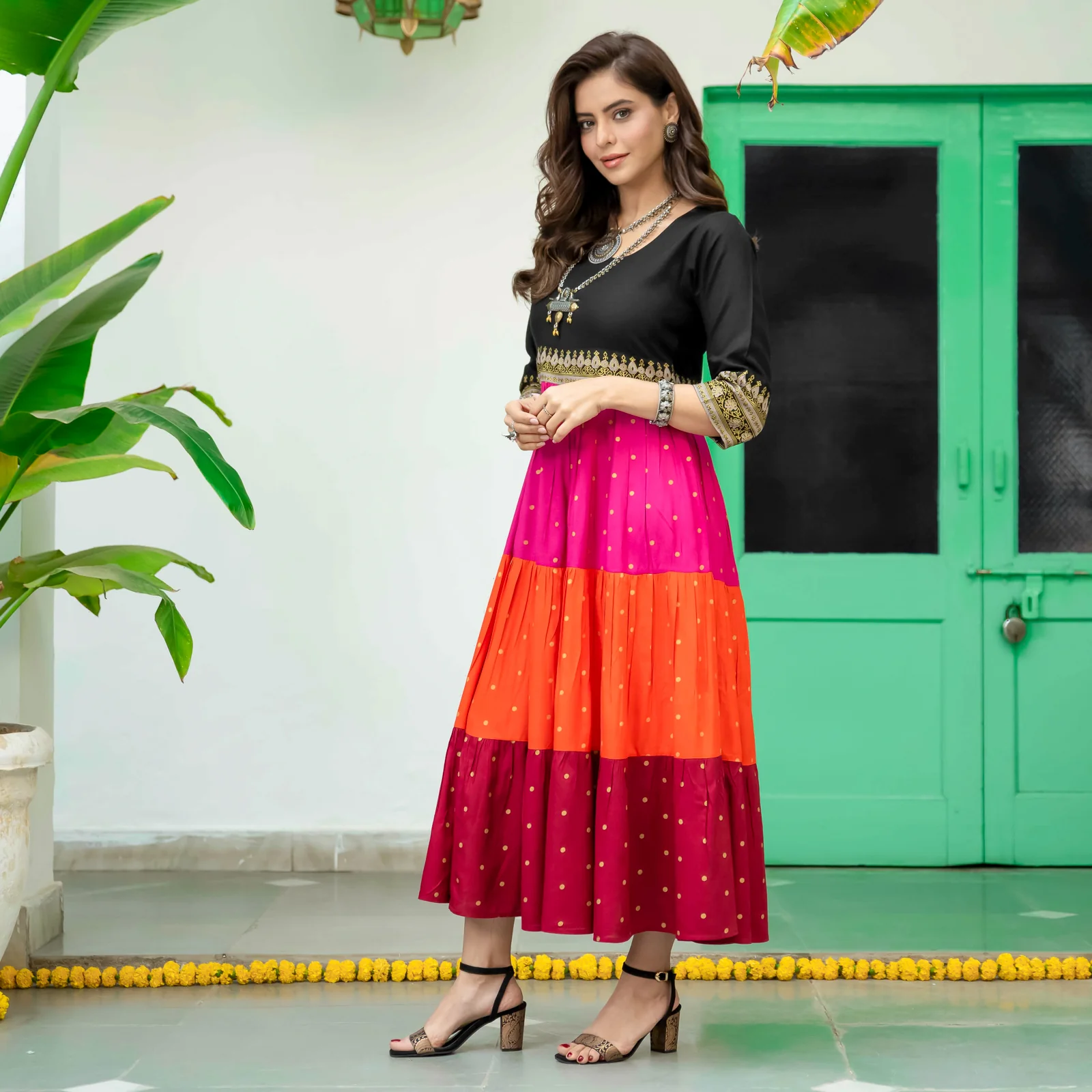 Fall in love with this beautiful flared tiered dress that is a classic example of traditional meeting contemporary. Beautiful Indian motifs and quirky polka prints adorn this design. And there is lovely gota detailing on the sleeves to make it perfect for any occasion. As always, this is crafted from breathable and sustainable LIVA rayon fabrics.