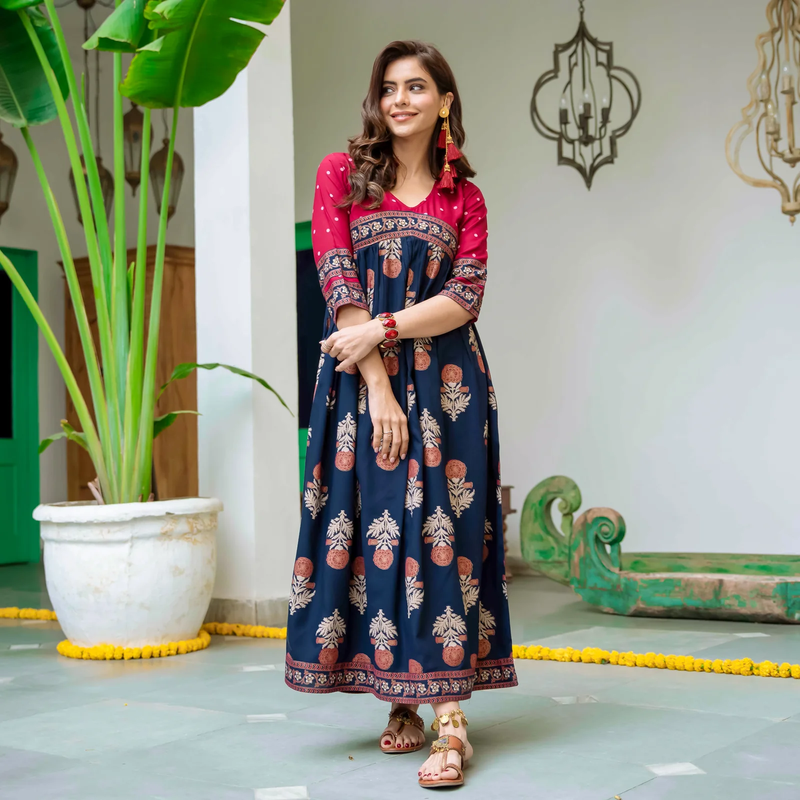The Blue & Maroon V-neck Alia Cut Dress combines traditional elegance with contemporary style.