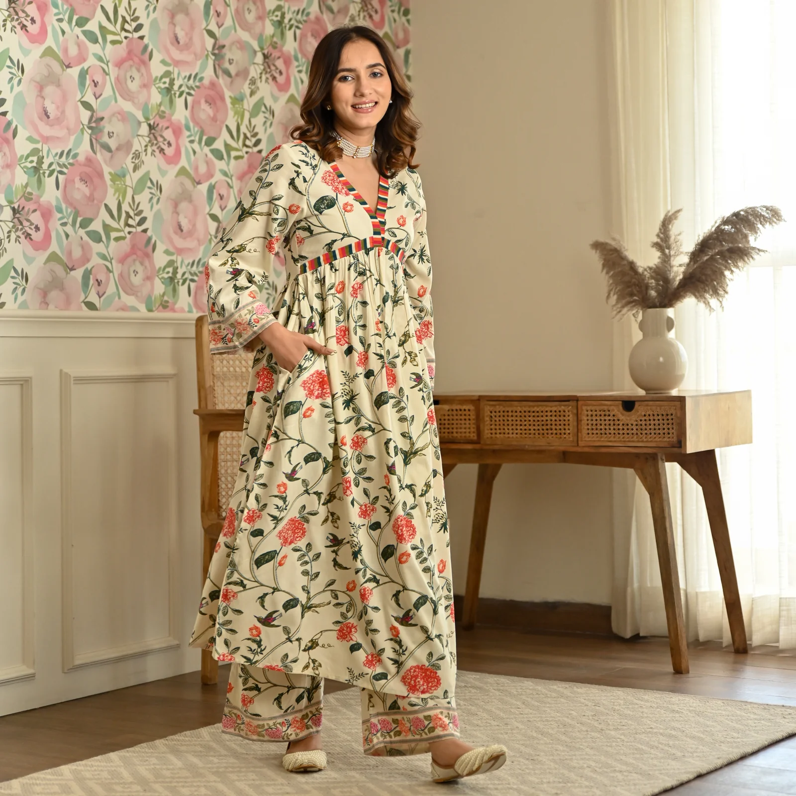 Feeling like spring with this Floral Jaal Kurta Set. Crafted with rayon fabric, this set features V neck, Gathers, Floral jaal print, and pockets.