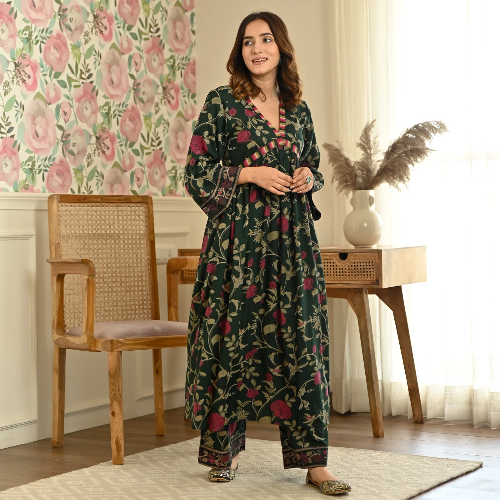 Feeling like spring with this Floral Jaal Kurta Pant Co-ord Set. Crafted with rayon fabric, this set features V neck, Gathers, Floral jaal print, and pockets. The kurta comes with pockets.