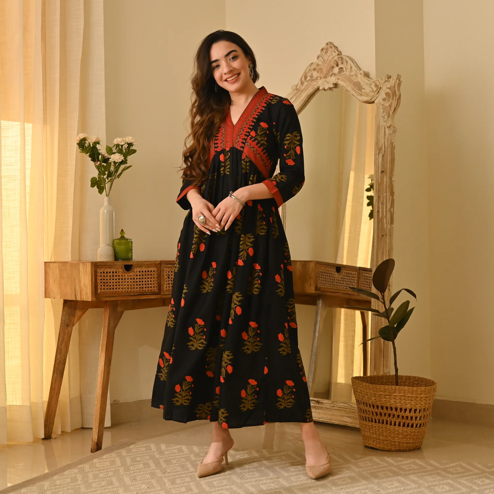 Your search for fit & flare dress end here! The dress features gathers on the yoke and floral motifs.