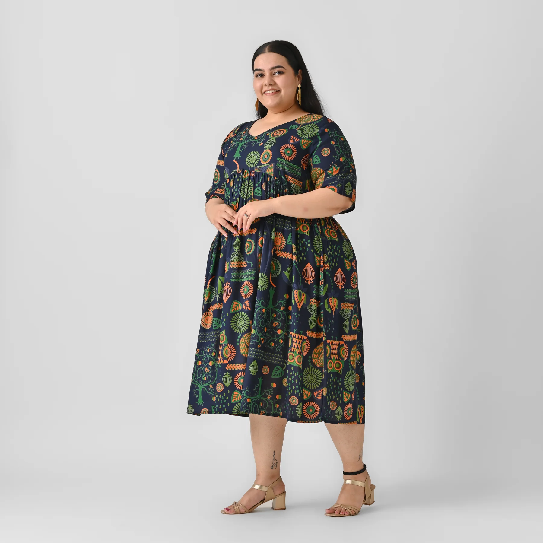 Coincide your ethnic style with contemporary silhouette with this adorable dress. Looks great for work wear as well as for casual lunch parties. The silhouette flaunts v neckline with gathers at the yoke. Team up this dress with earrings and heels.