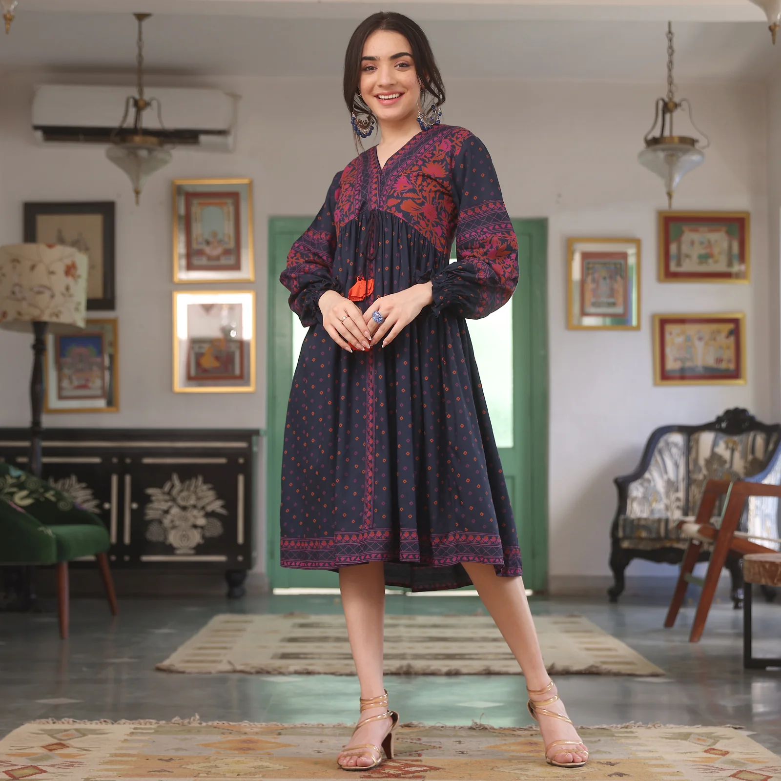 Emphasize your bellowing appearance with this printed dress. The dress features an all-over hand block print, v neckline, full sleeves with front tie-up