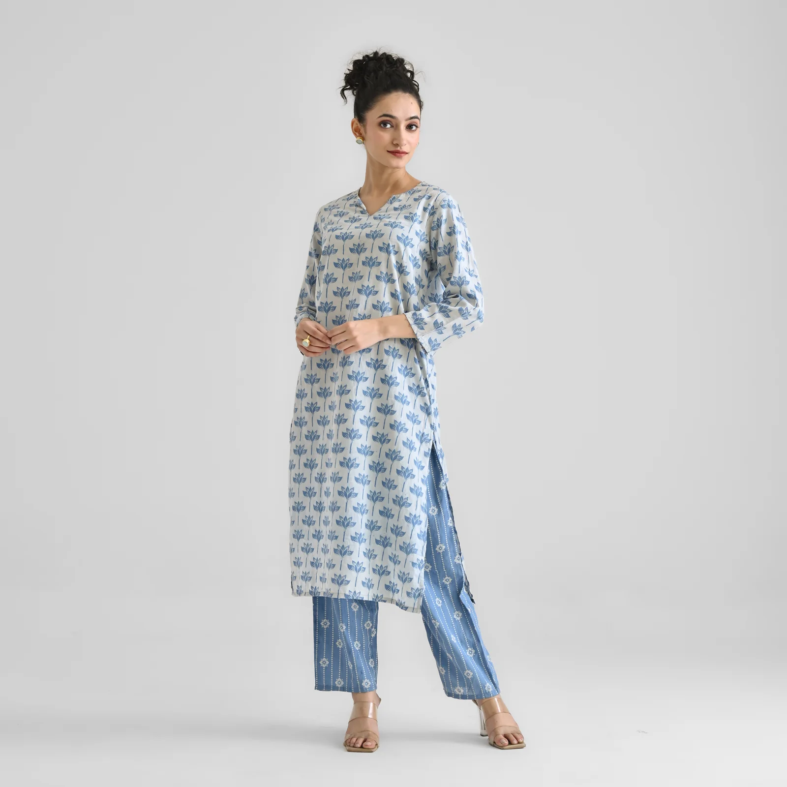 Light Blue Lotus Dabu Inspired Cotton Kurta with Notch Neckline