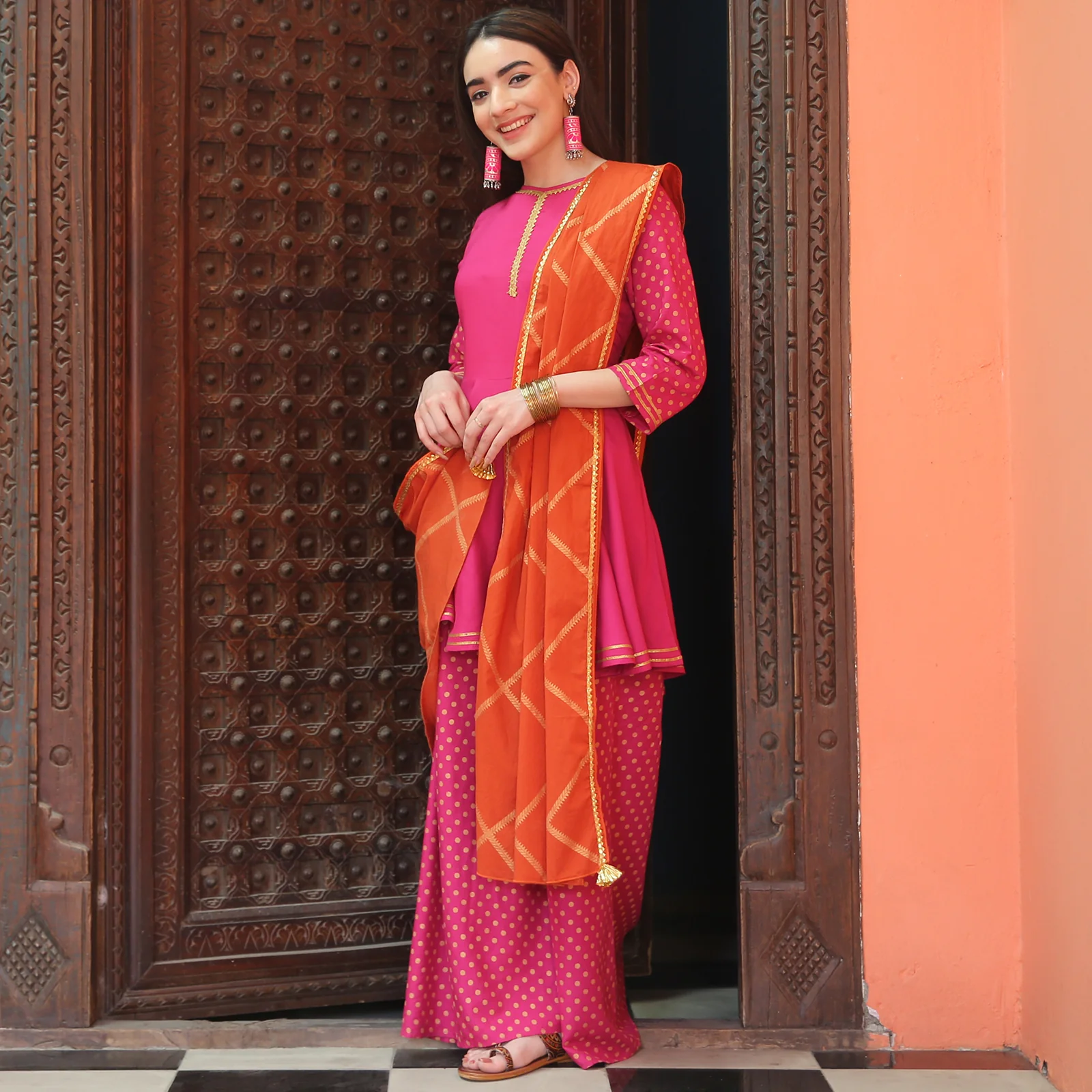 The perfect outfit for a special function or event, this Magenta Festive Gold Printed Peplum Sharara Dupatta Set is capable of adding oomph to your personal ethnic wear collection. The magenta kurta and sharara are paired with a vibrant crimson dupatta. Patterned with tiny polkas, the kurta and sharara look great on any body type! The peplum layer on the kurta is perfect if you want a simple outfit with a trendy twist. The dupatta is literally the cherry on the cake!