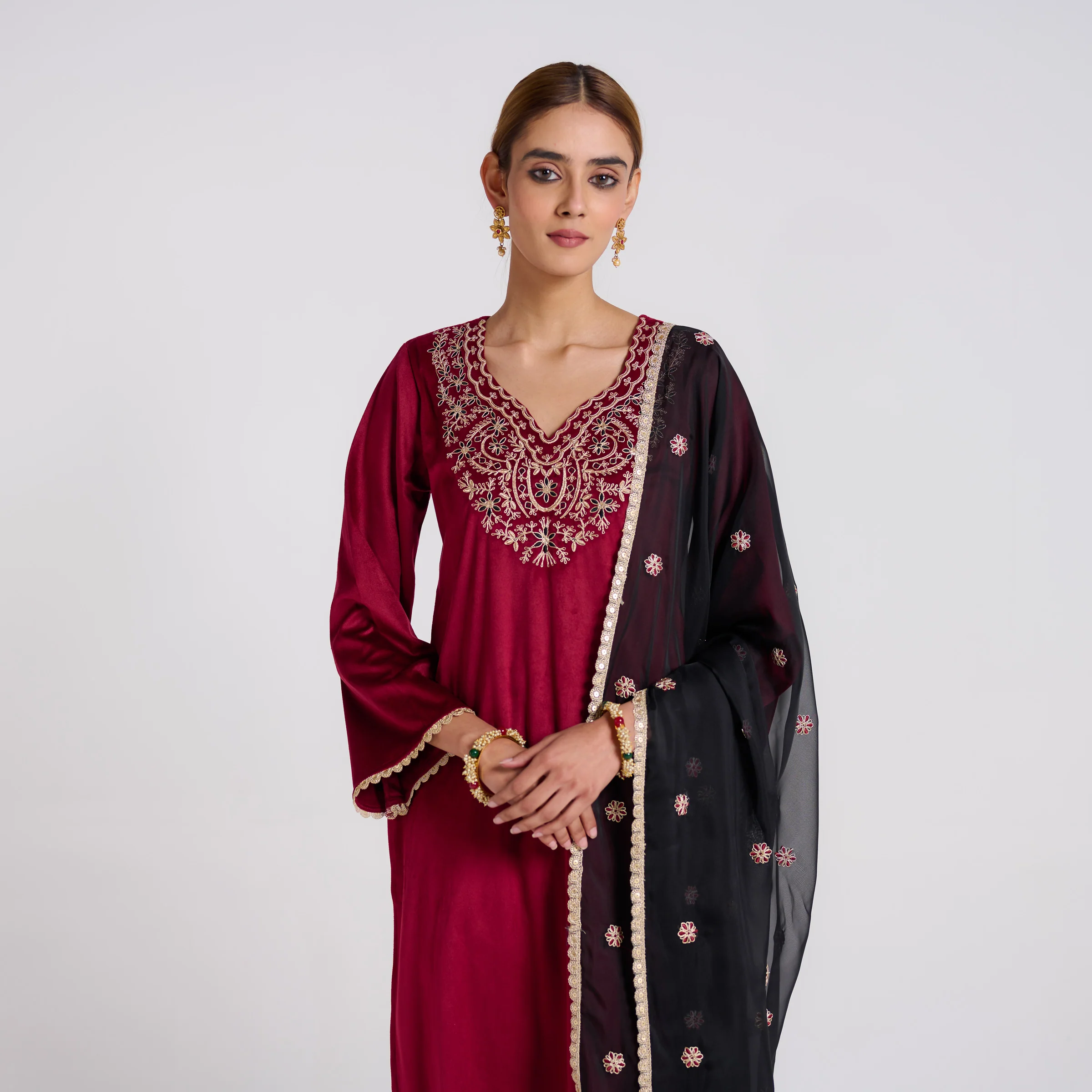 Maroon Blue Embroidered Amara Velvet Kurta Set with Dupatta
