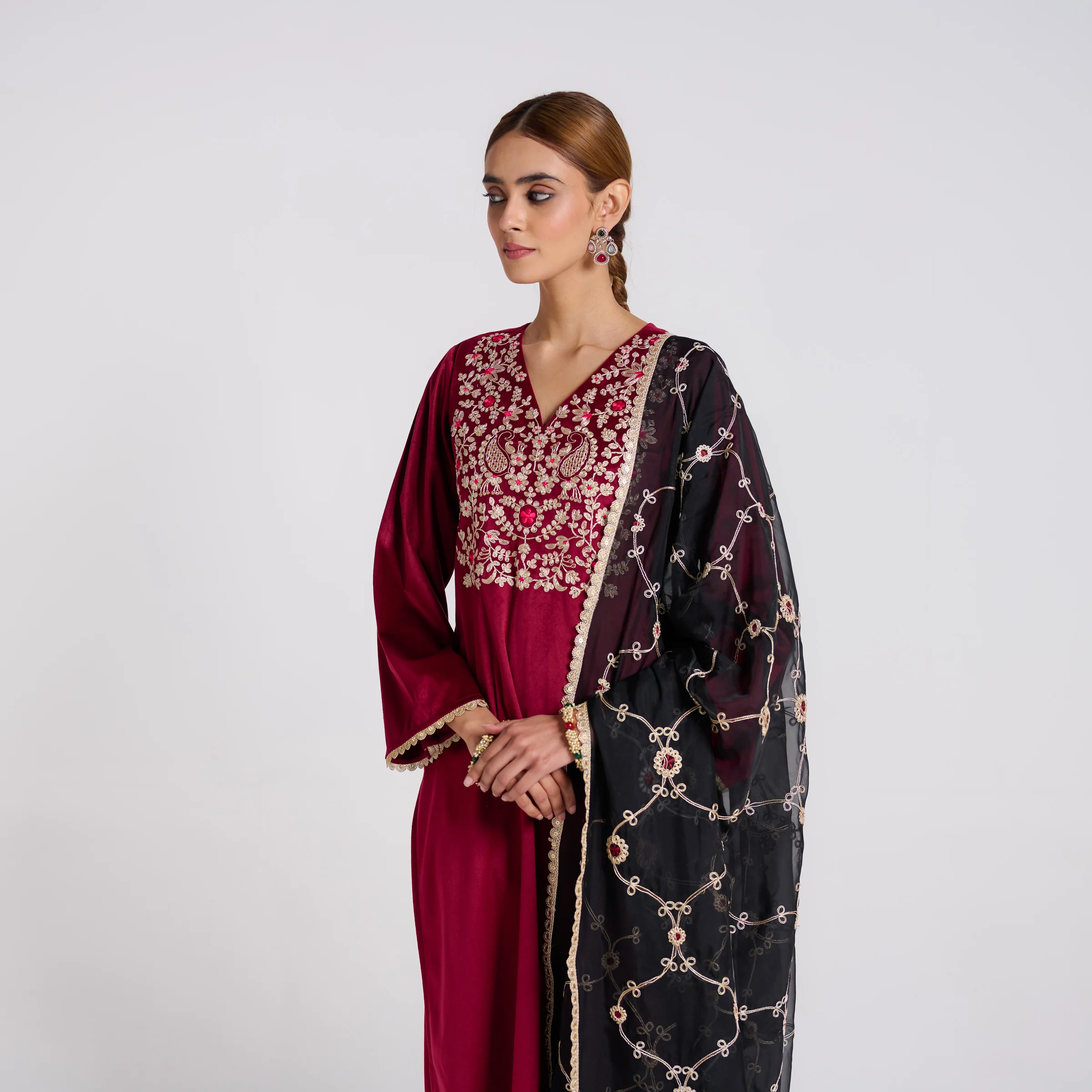 Maroon Embroidered Gulzaar Velvet Set with Dupatta