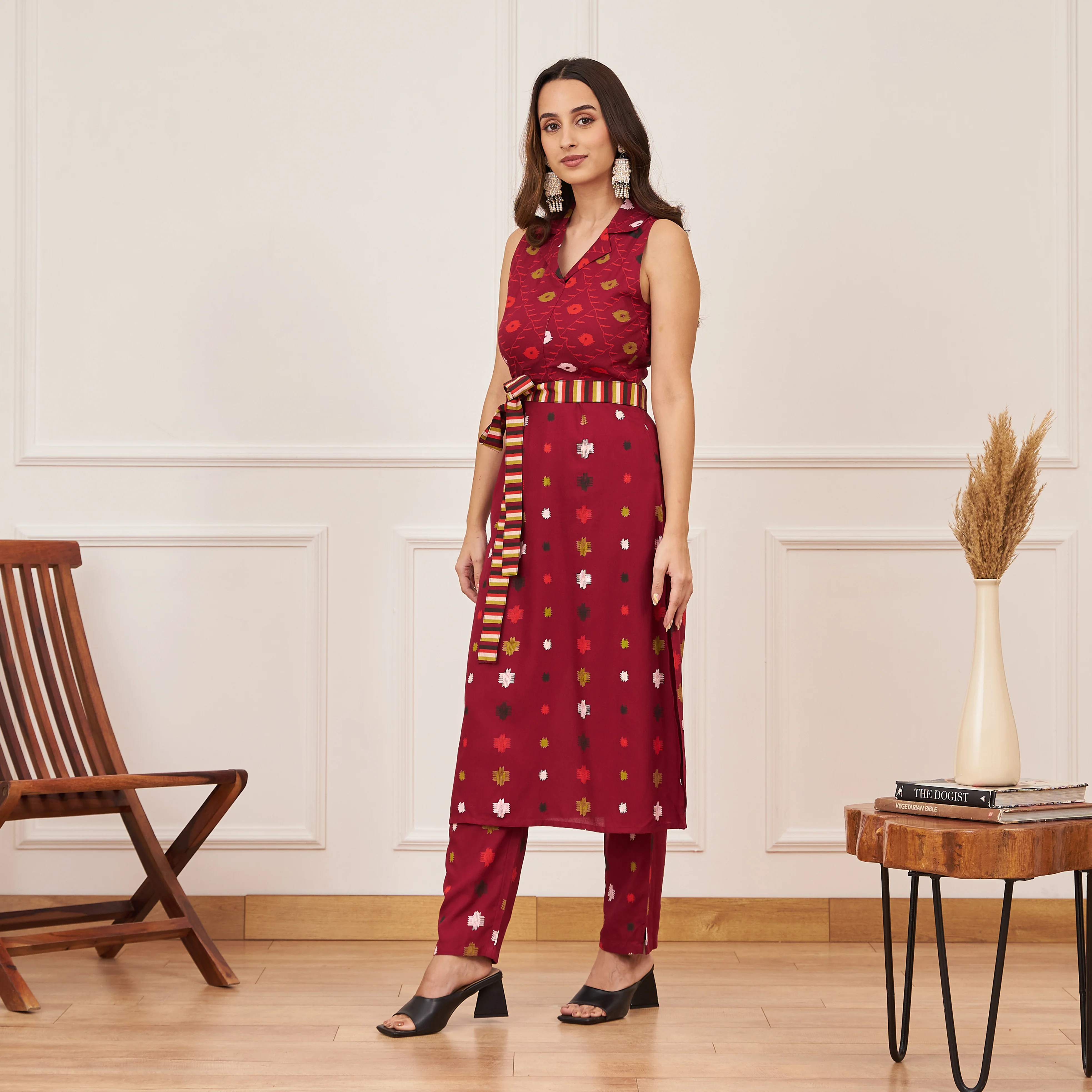 Maroon Ikat Inspired Kurta Pant Co-ord Set with Belt