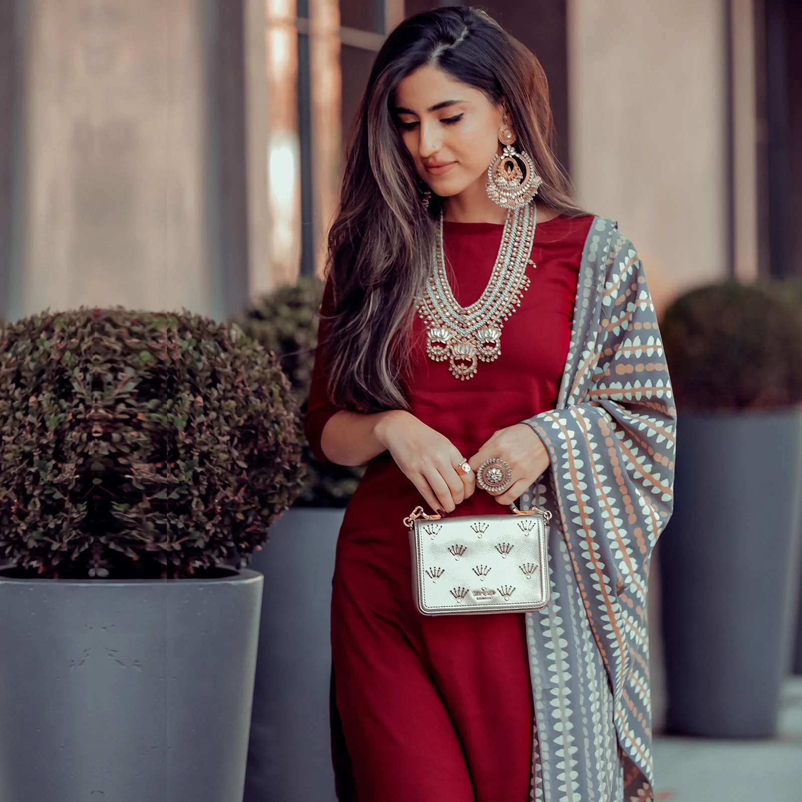 Maroon Salwar Kurta Set with Grey Dupatta