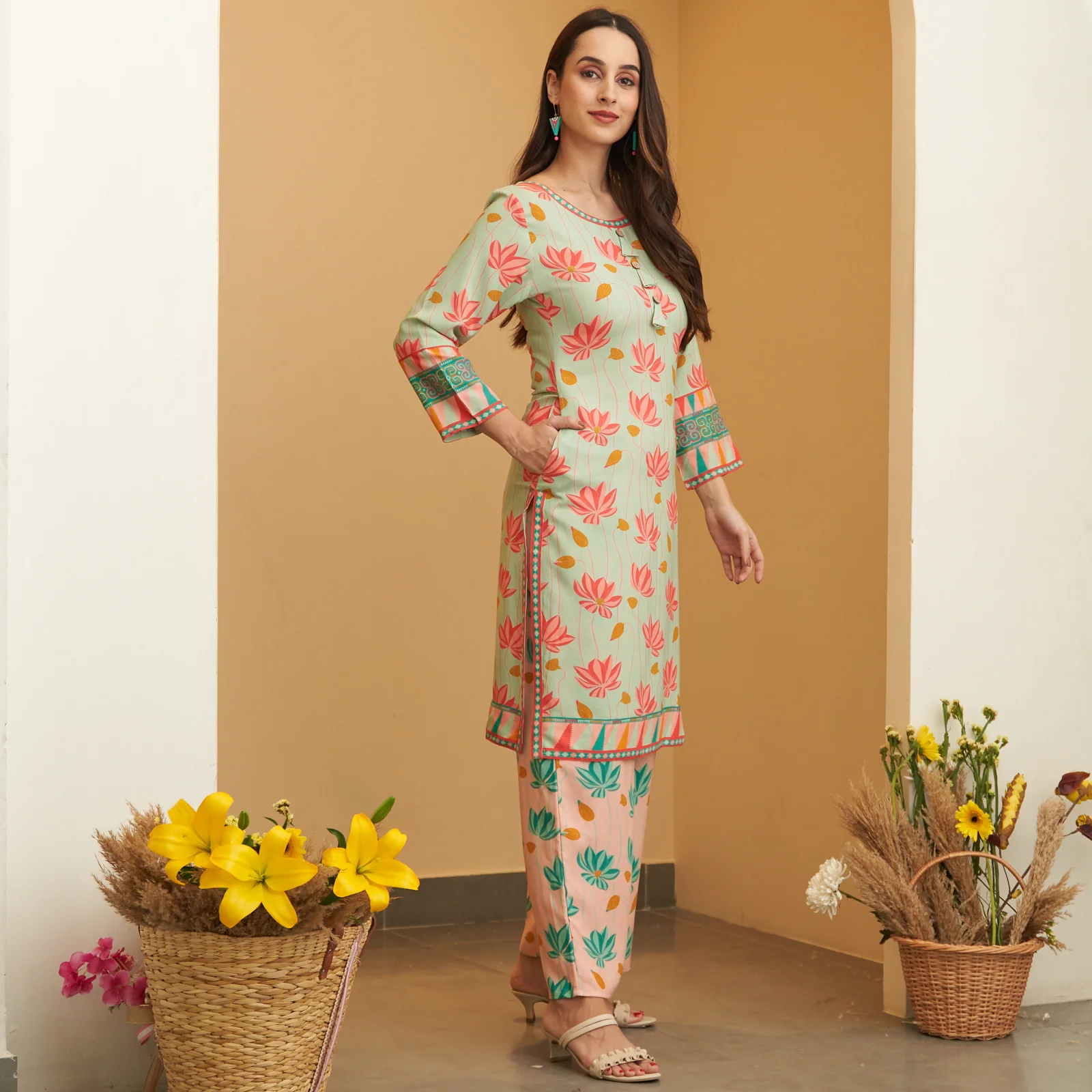 -70%Mint Green Pink Lotus Print Kurta Pant Co-ord Set—