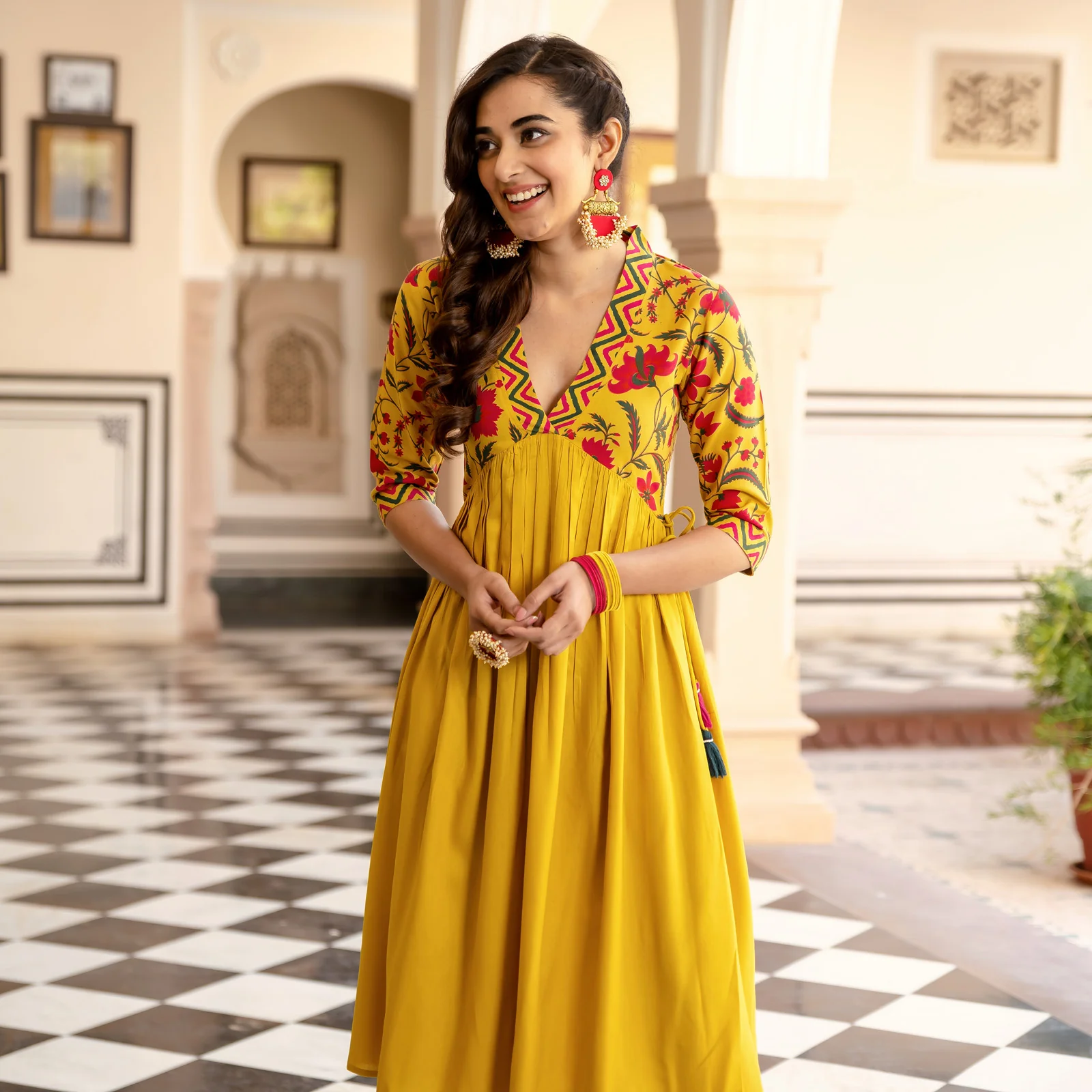 Channel your desi diva vibes and experience luxury with our Alia Cut gathered dress. The dress features printed yoke, side drawstrings, pockets and tassels detailing. Style this with statement earrings and heels.