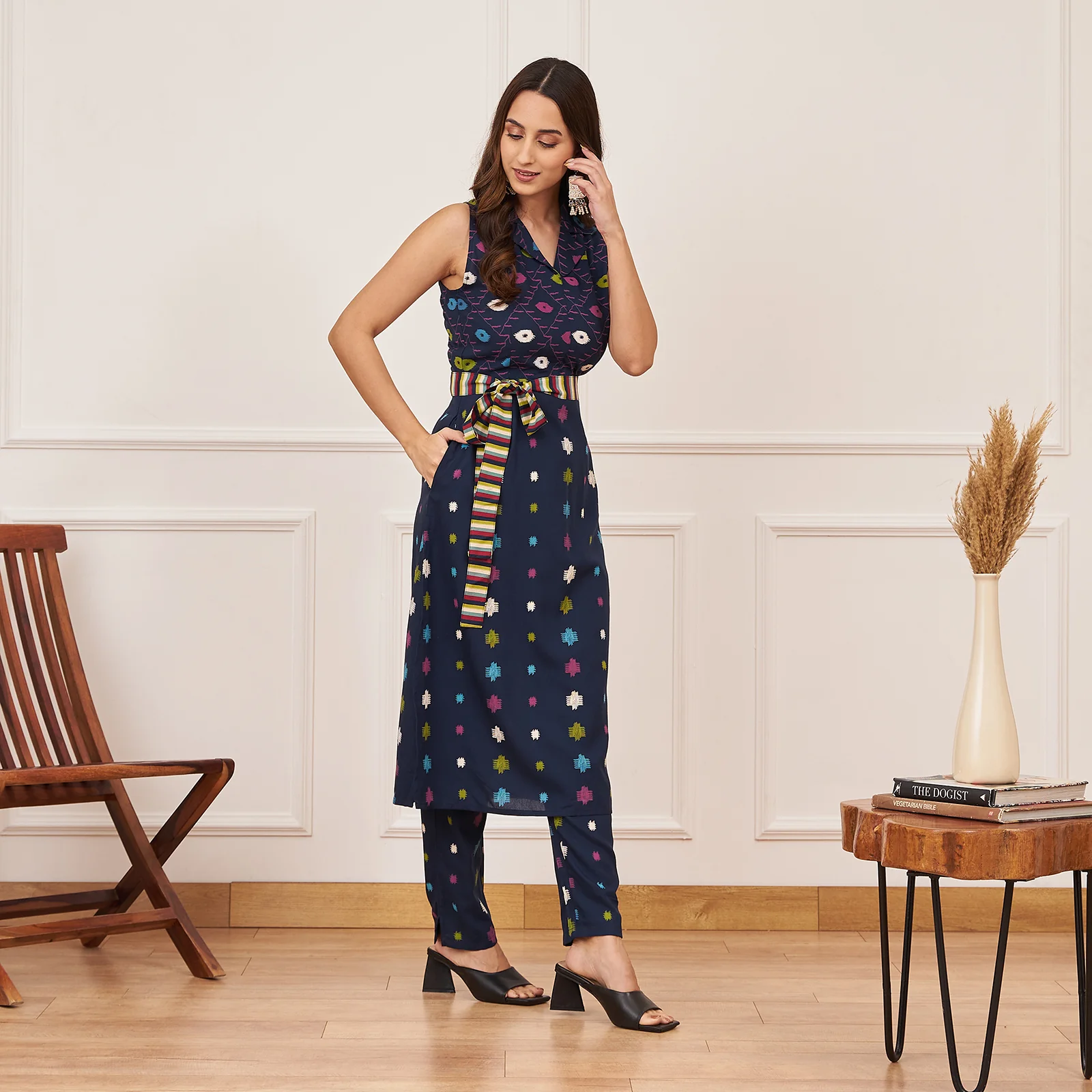 Channeling the timeless beauty of Ikat with this chic sleeveless kurta pant co ord set. The collared neckline adds a touch of sophistication, while the belted waist creates a flattering silhouette. Perfect for any occasion!