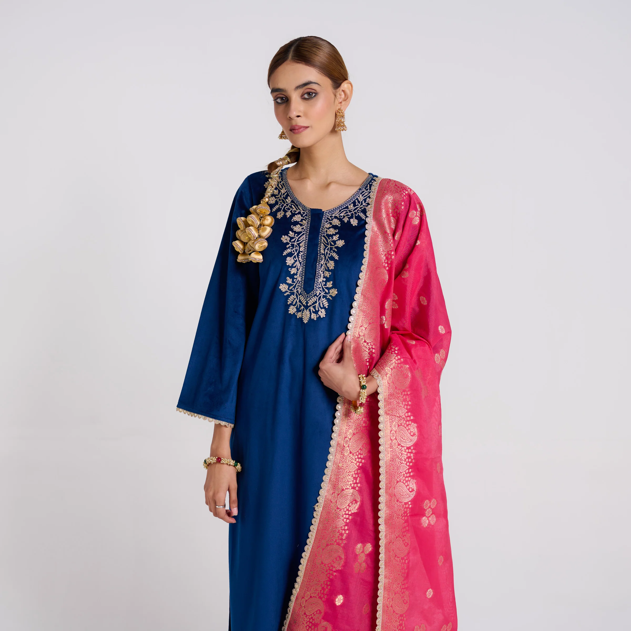 Navy Embroidered Noor Velvet Set with Brocade Dupatta