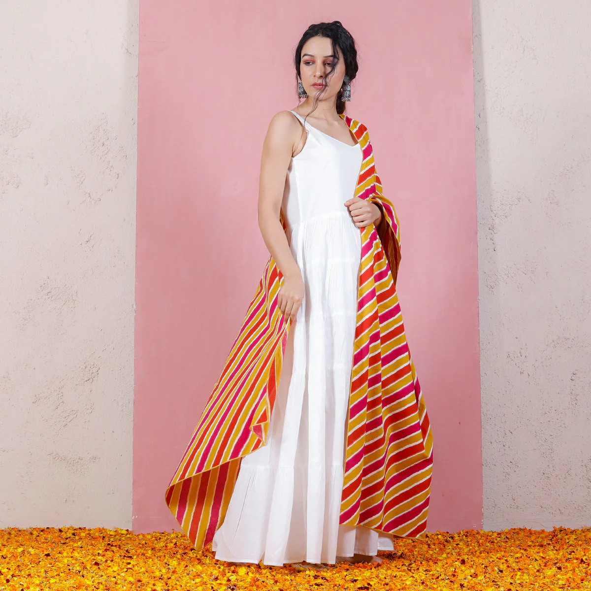Peach & Pink Leheriya Inspired Dupatta with White Tiered Dress