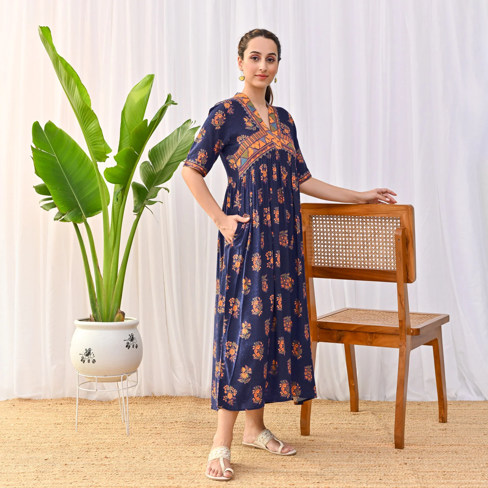 Peppy Blue V Neck Alia Cut Gathered Dress