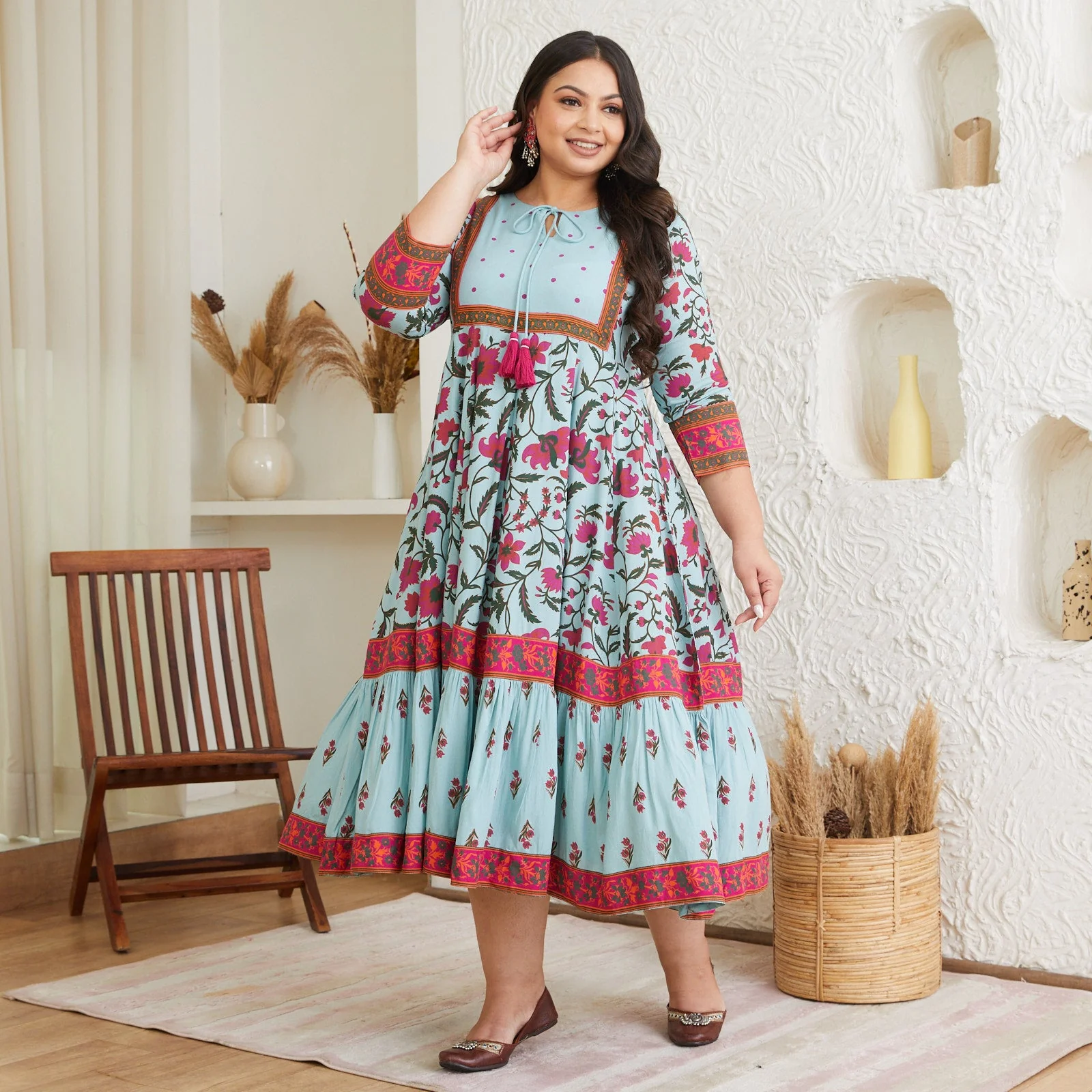 Embrace a Dewey look with this Sky Blue and pink Floral Dress. The dress is flared with pocket and hem detailing, designed for the day out. Just slip it on and you're set for the day!