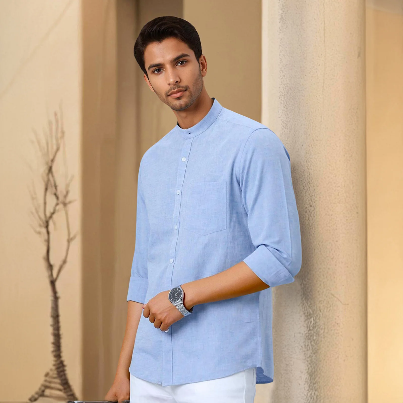 Sky Blue Mandarin Collar Solid Linen Cotton Shirt for Men